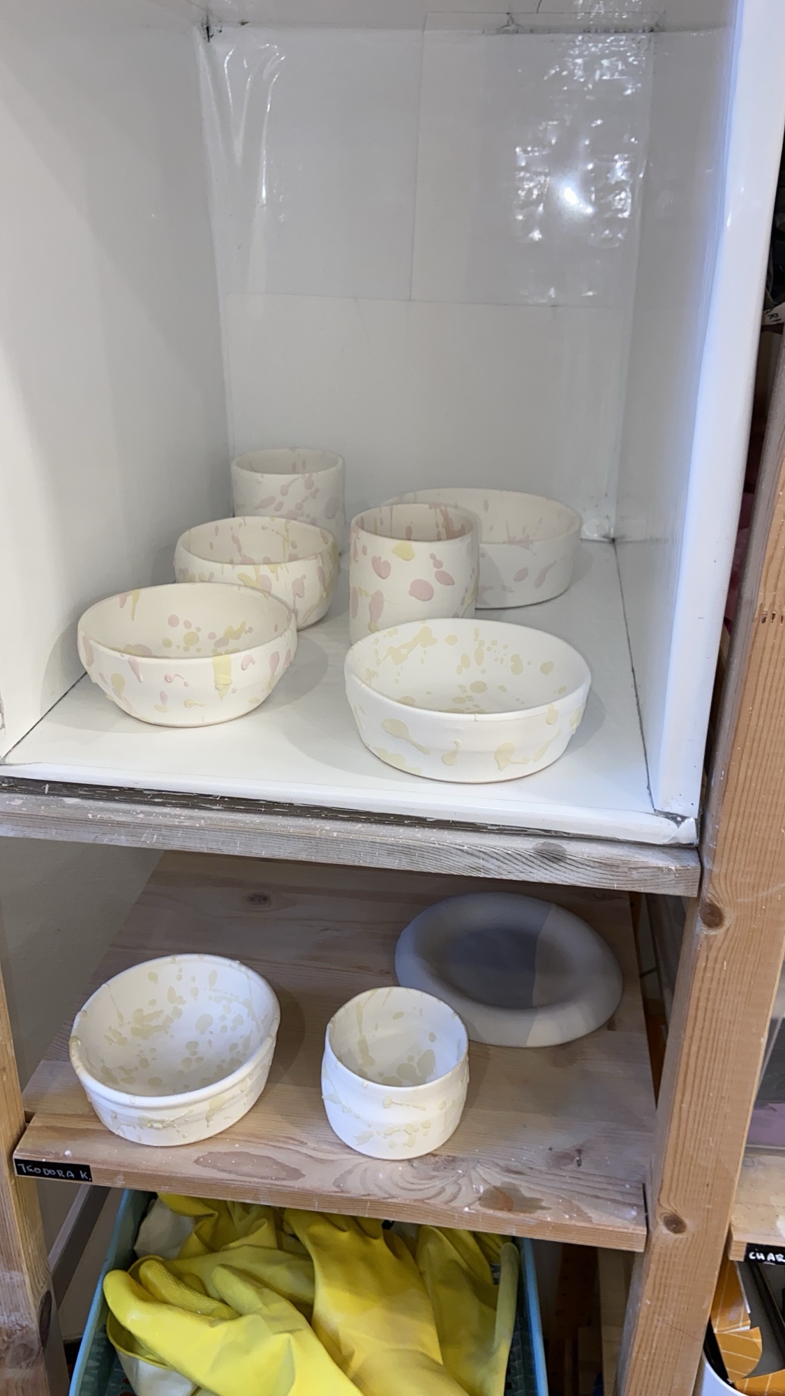 Söndag: dags för keramik! Glaserade allt jag plockade ihop dagen innan. Vi får se hur detta skvättexperiment går. Har bara tillgång till doppglasyrer just nu nämligen så det kan bli lite hur som helst. Skvätte rosa och gul på en vit bas.