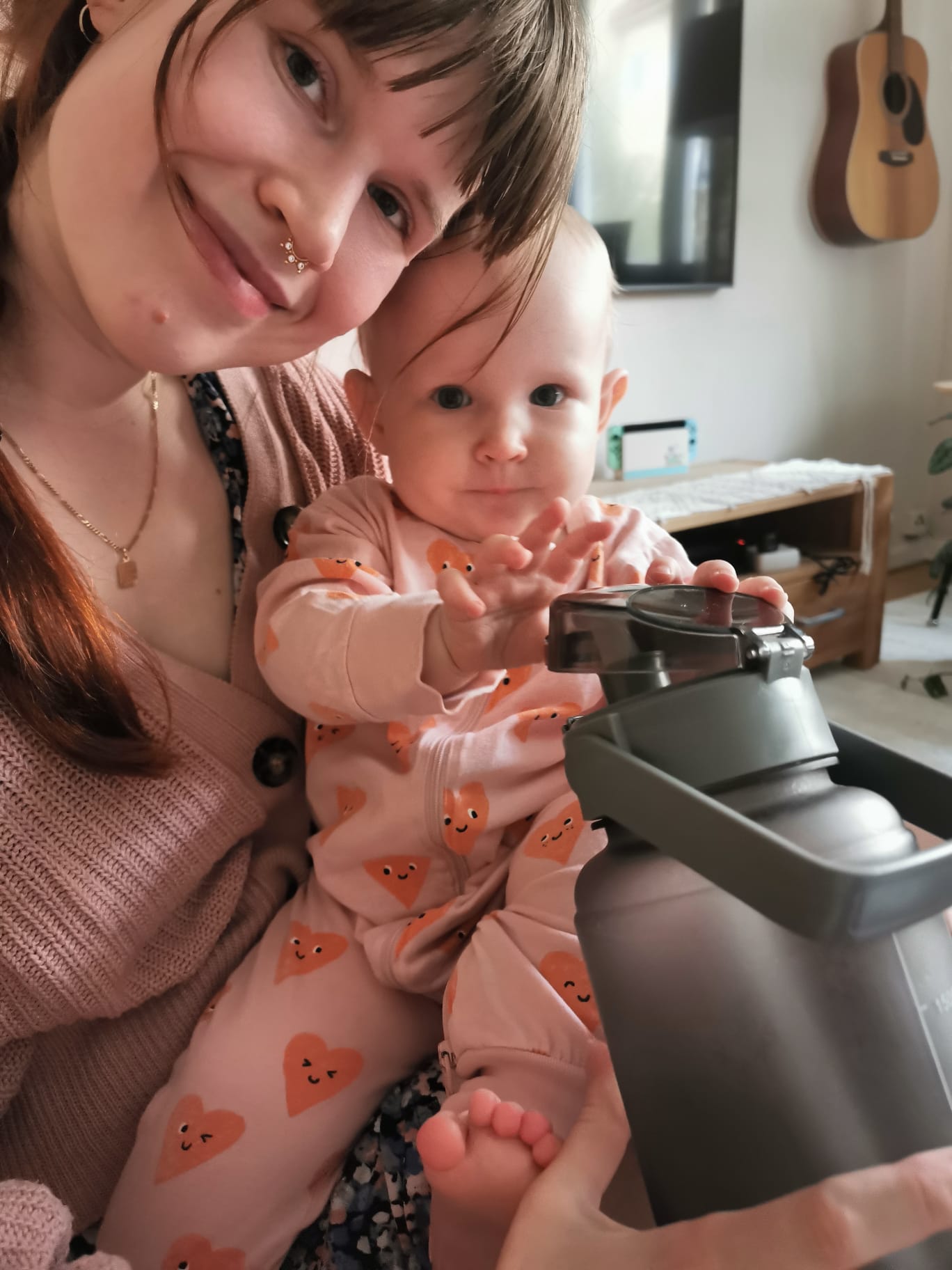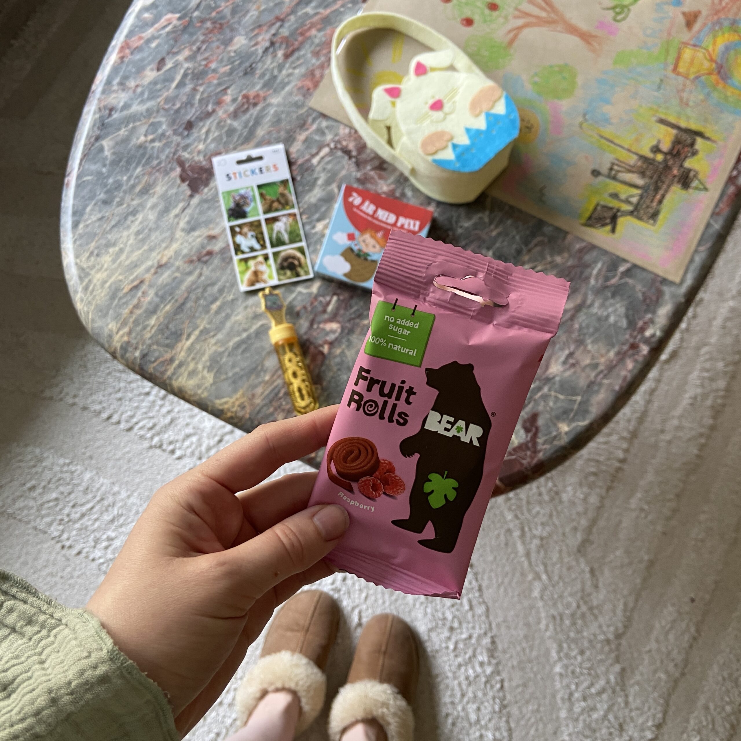 Hon högg fruktrullen direkt och bad att få sätta på sig strumporna också. Sen läste vi jättelänge.