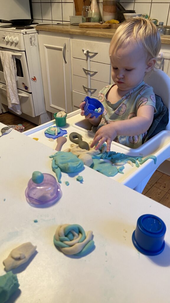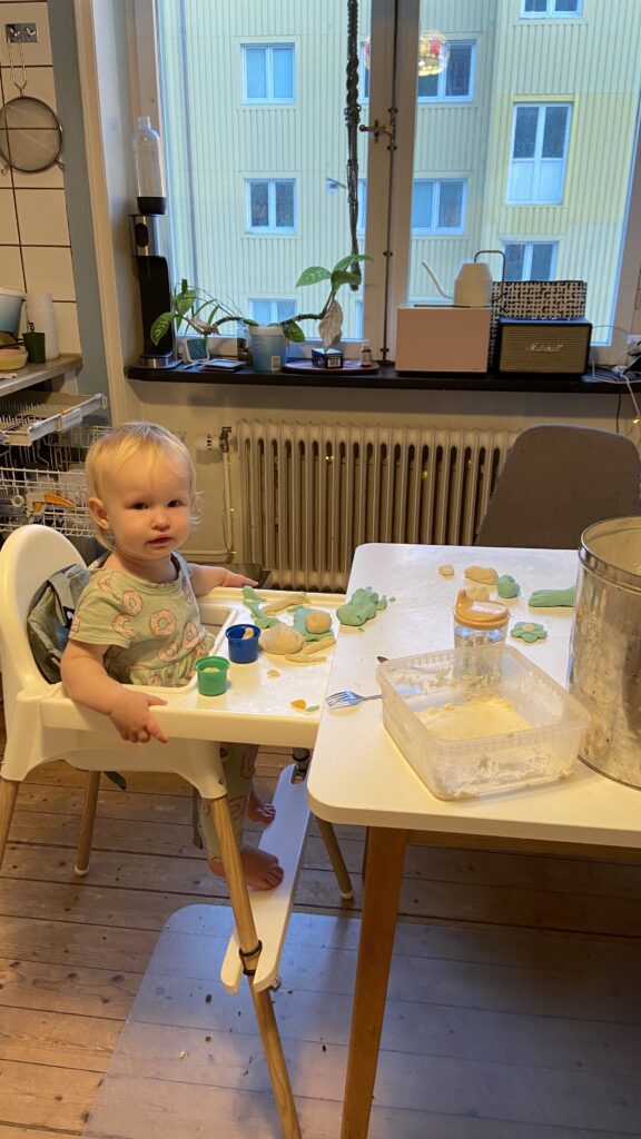 När vi hade sjukstuga hemma passade jag på att baka ihop lite trolldeg för första gången. Juna har precis börjat komma in i en ålder där det kan vara roligt att börja göra små pyssel så jag tänkte varför inte prova nu. Det var kul och mysigt men vi gjorde såklart mycket tillsammans. Märker hur hon inte riktigt självständigt sitter och bygger, knådar och pysslar men om jag hänger på så satt vi ändå en bra stund med julmusik på i bakgrunden.